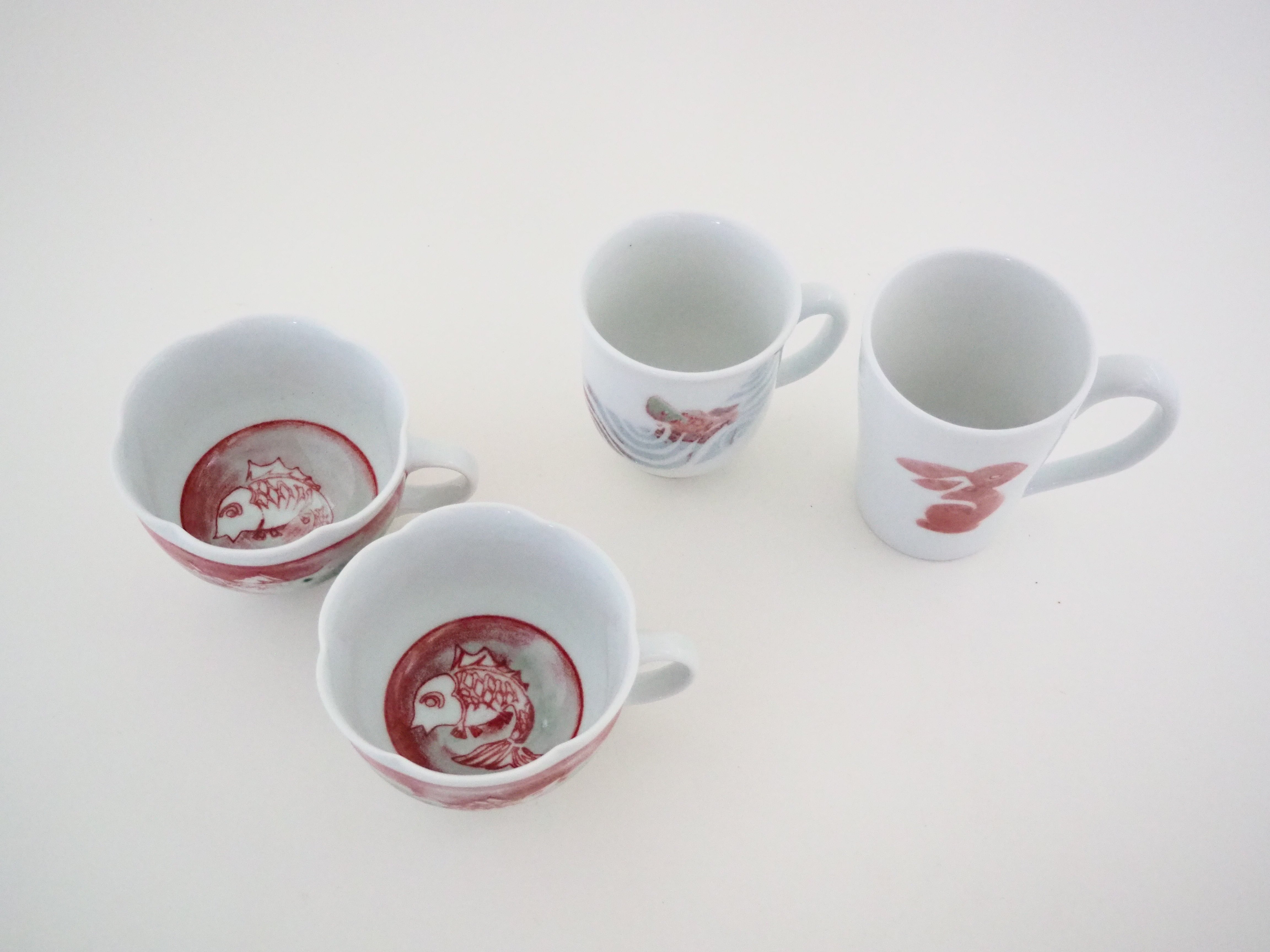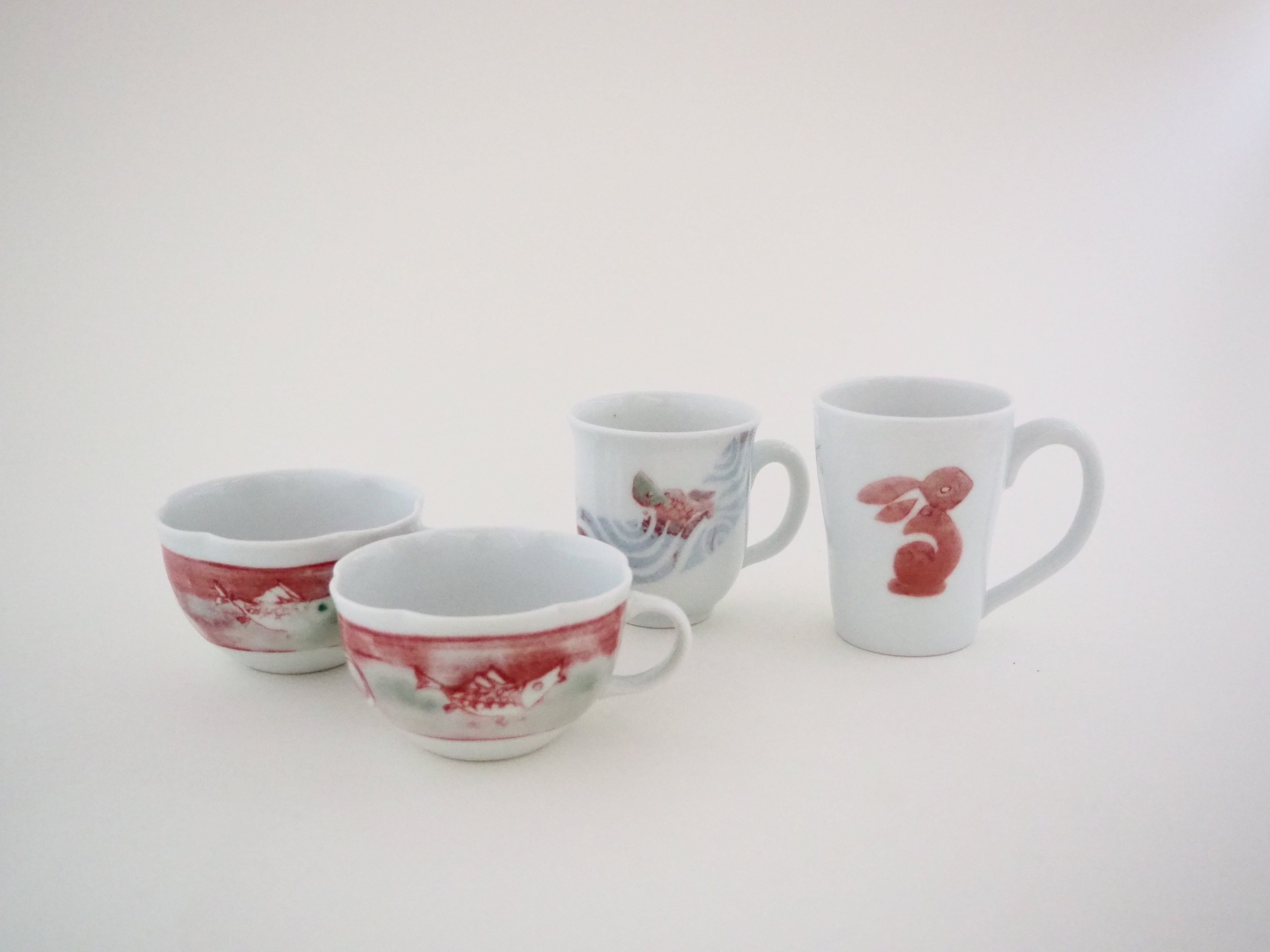マグカップ(2ケ)と 花縁碗(2ケ)の カップいろいろのセットです。