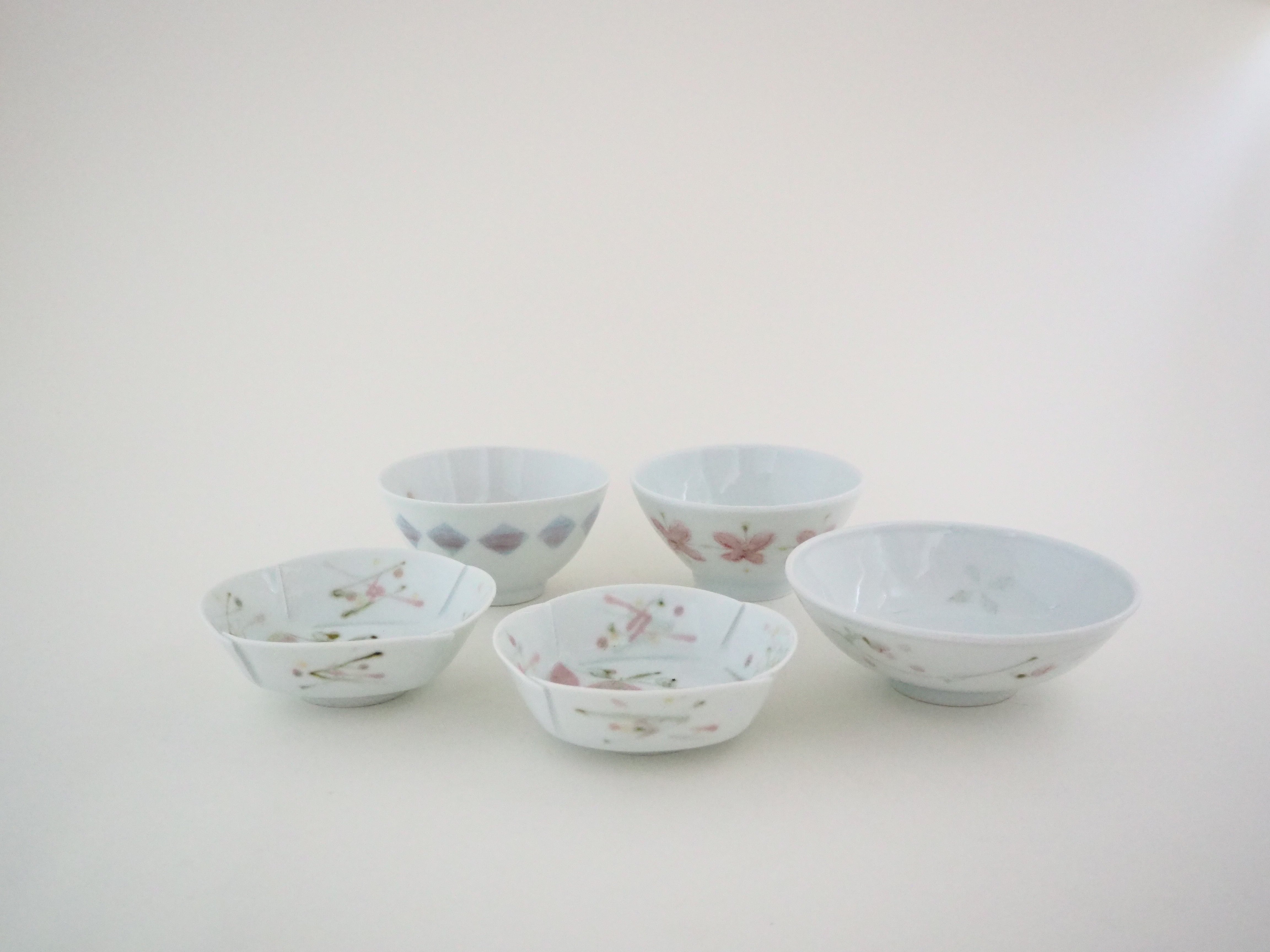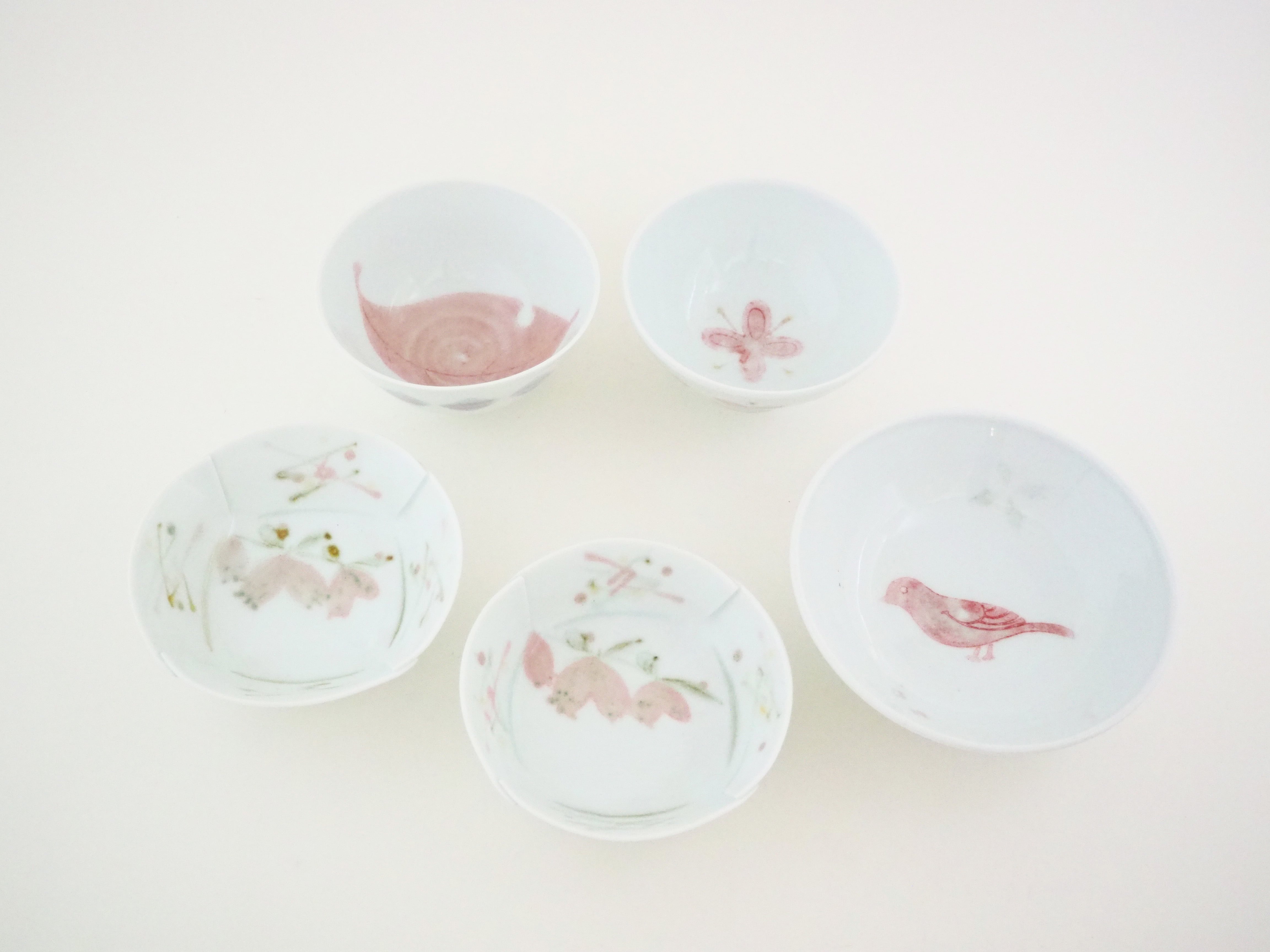 四つ花文、木の葉文の飯碗、蛍袋文の小鉢、とり文の丸平鉢と