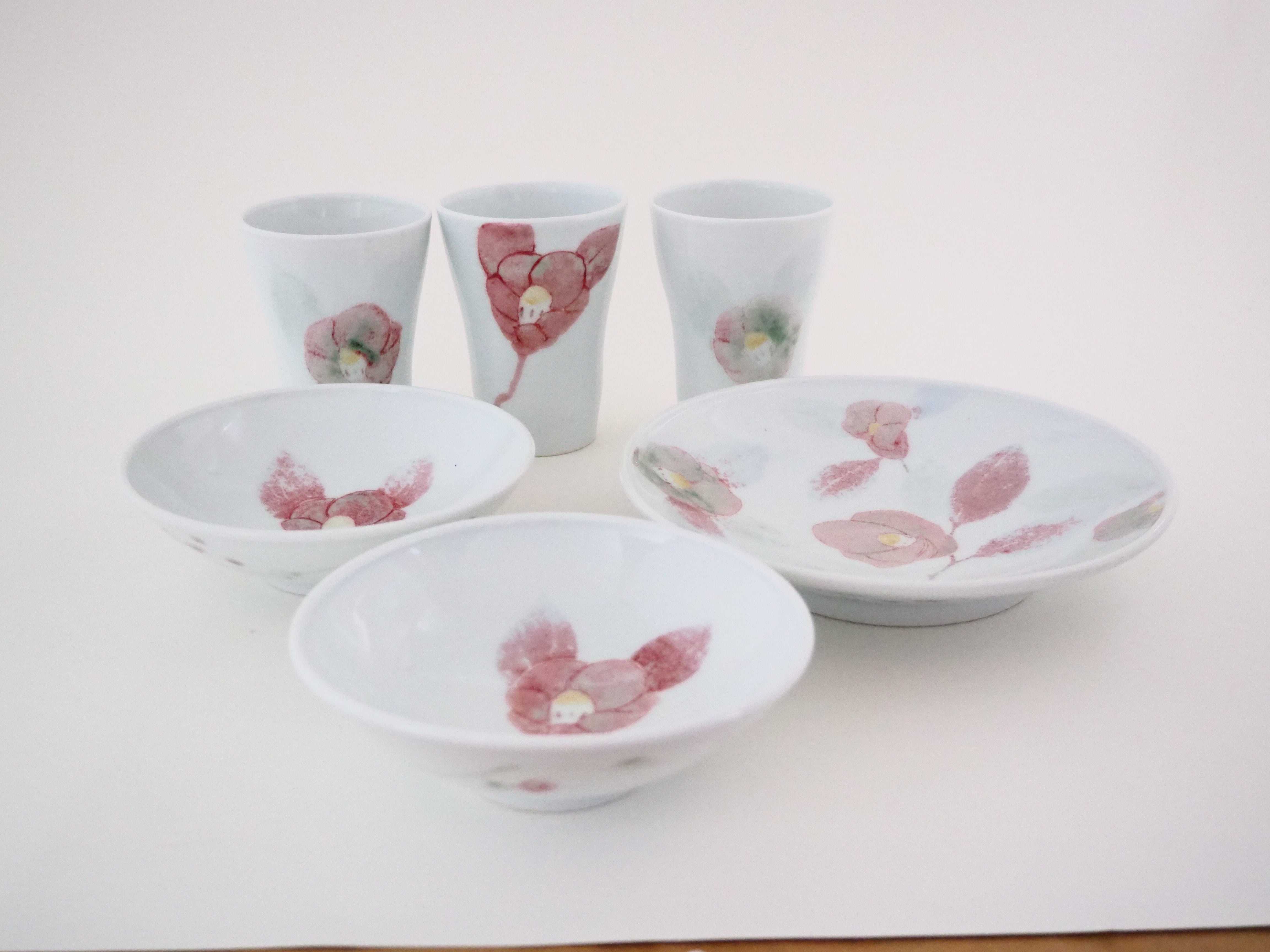 釉裏紅の紅色が綺麗な、椿づくしの器のセットです。